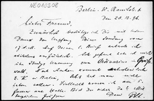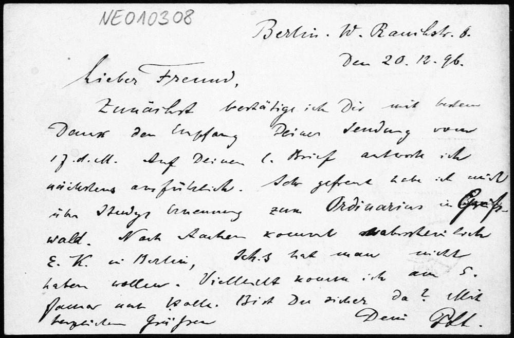 Postkarte von Paul Stäckel an Friedrich Engel vom 20.12.1896