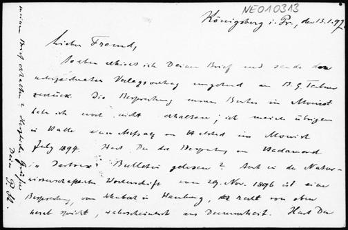 Postkarte von Paul Stäckel an Friedrich Engel vom 13.1.1897