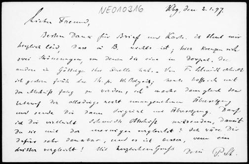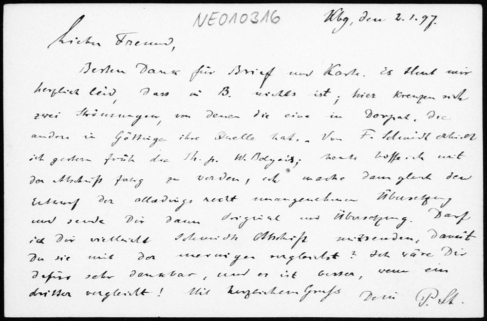 Postkarte von Paul Stäckel an Friedrich Engel vom 2.2.1897