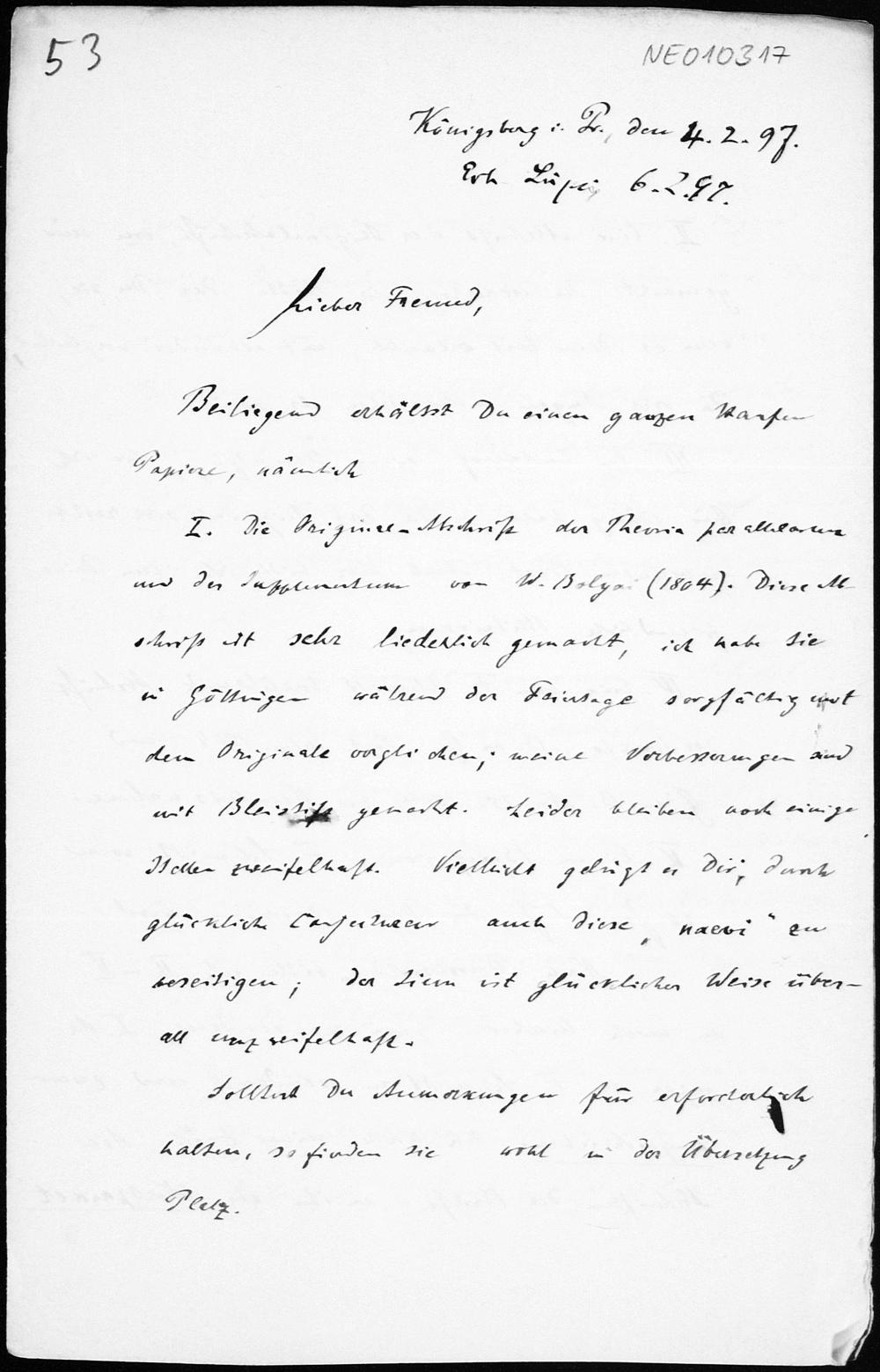 Brief von Paul Stäckel an Friedrich Engel vom 4.2.1897