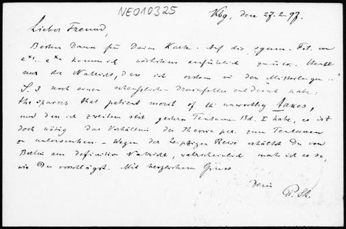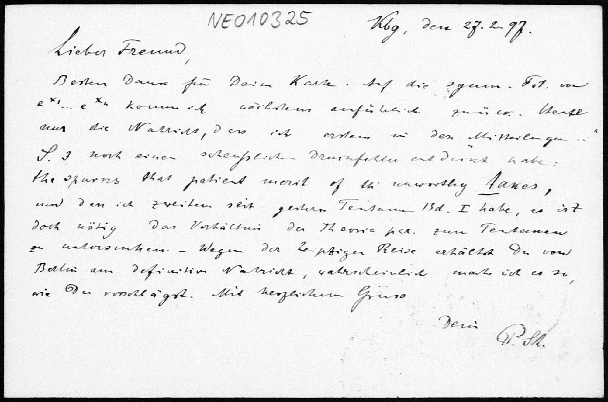 Postkarte von Paul Stäckel an Friedrich Engel vom 27.2.1897