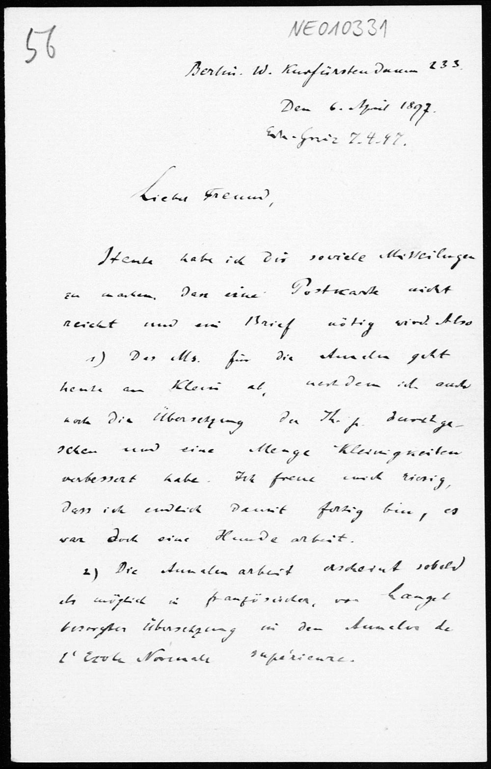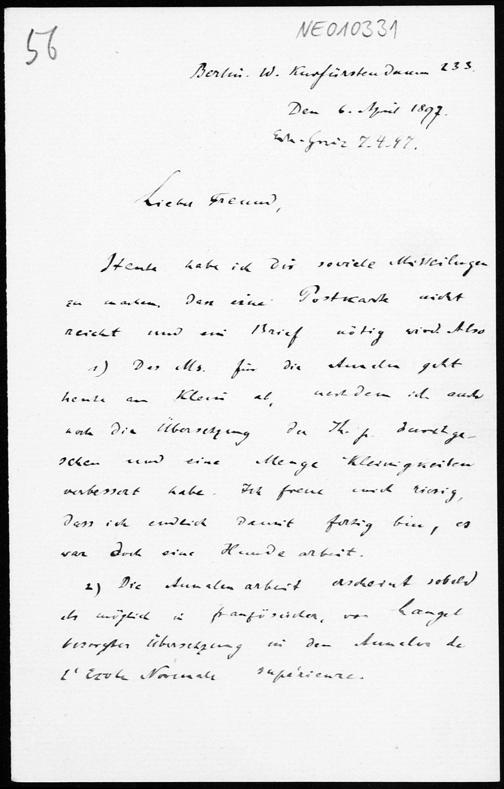 Brief von Paul Stäckel an Friedrich Engel vom 6.4.1897