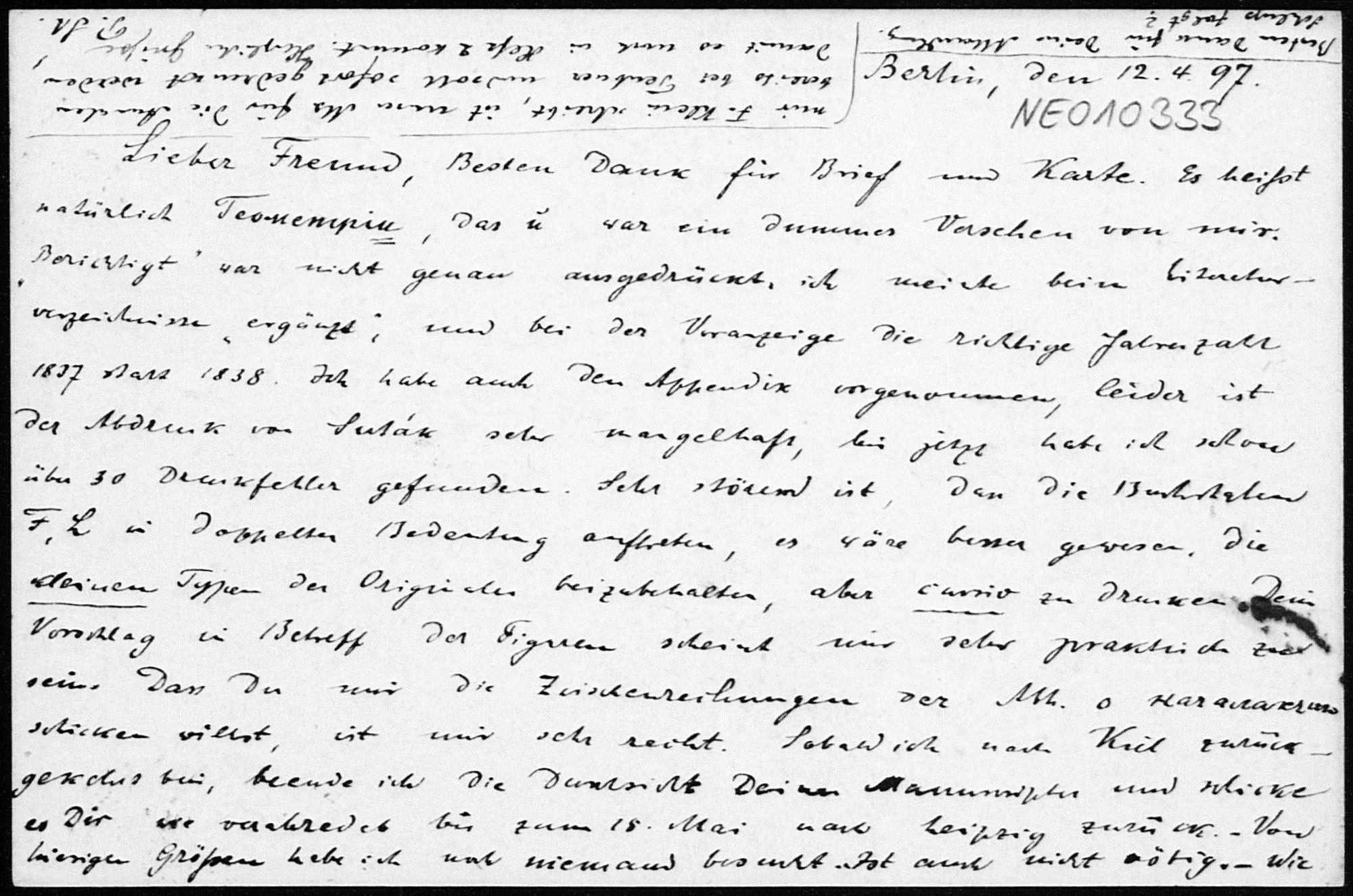 Postkarte von Paul Stäckel an Friedrich Engel vom 12.4.1897