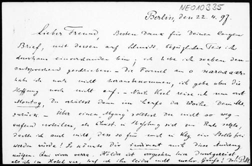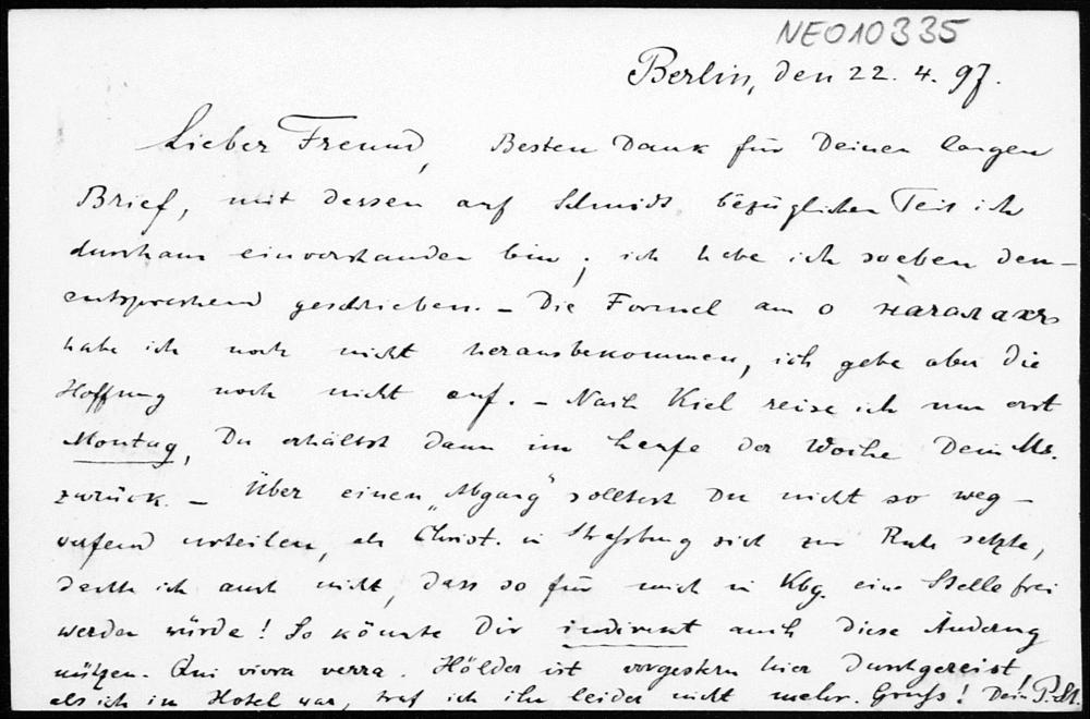Postkarte von Paul Stäckel an Friedrich Engel vom 22.4.1897