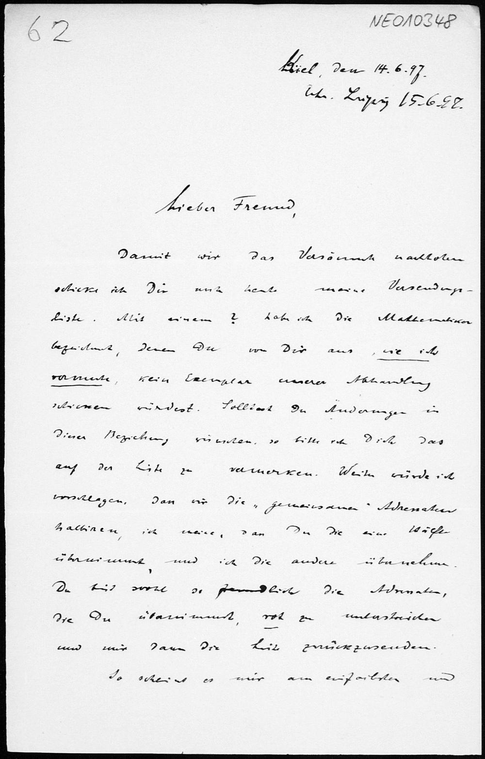 Brief von Paul Stäckel an Friedrich Engel vom 14.6.1897