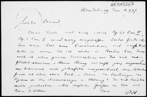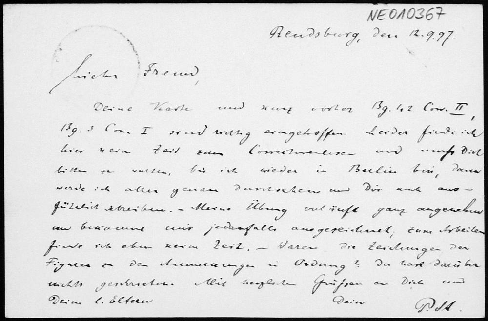 Postkarte von Paul Stäckel an Friedrich Engel vom 12.9.1897