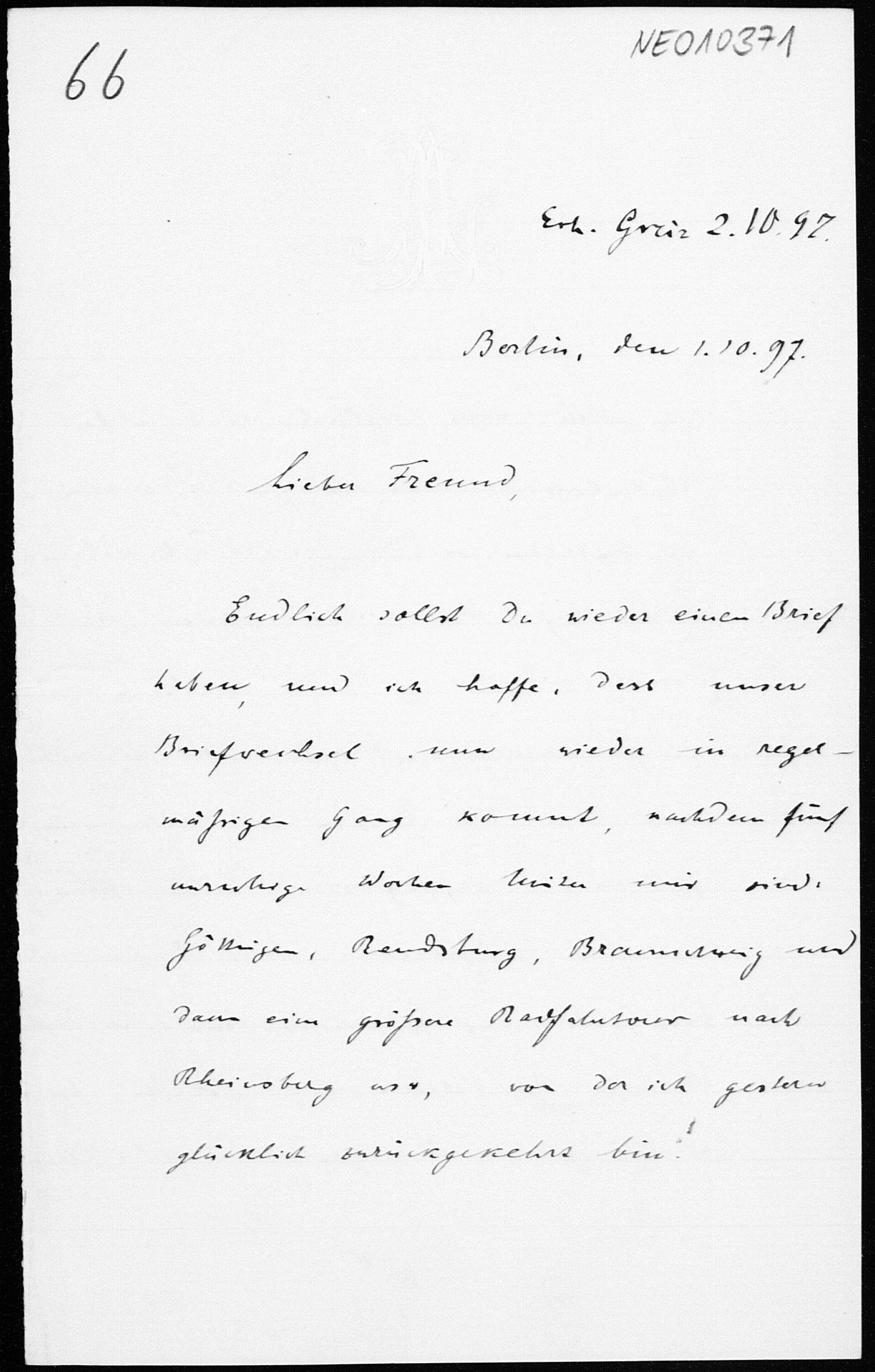 Brief von Paul Stäckel an Friedrich Engel vom 1.10.1897