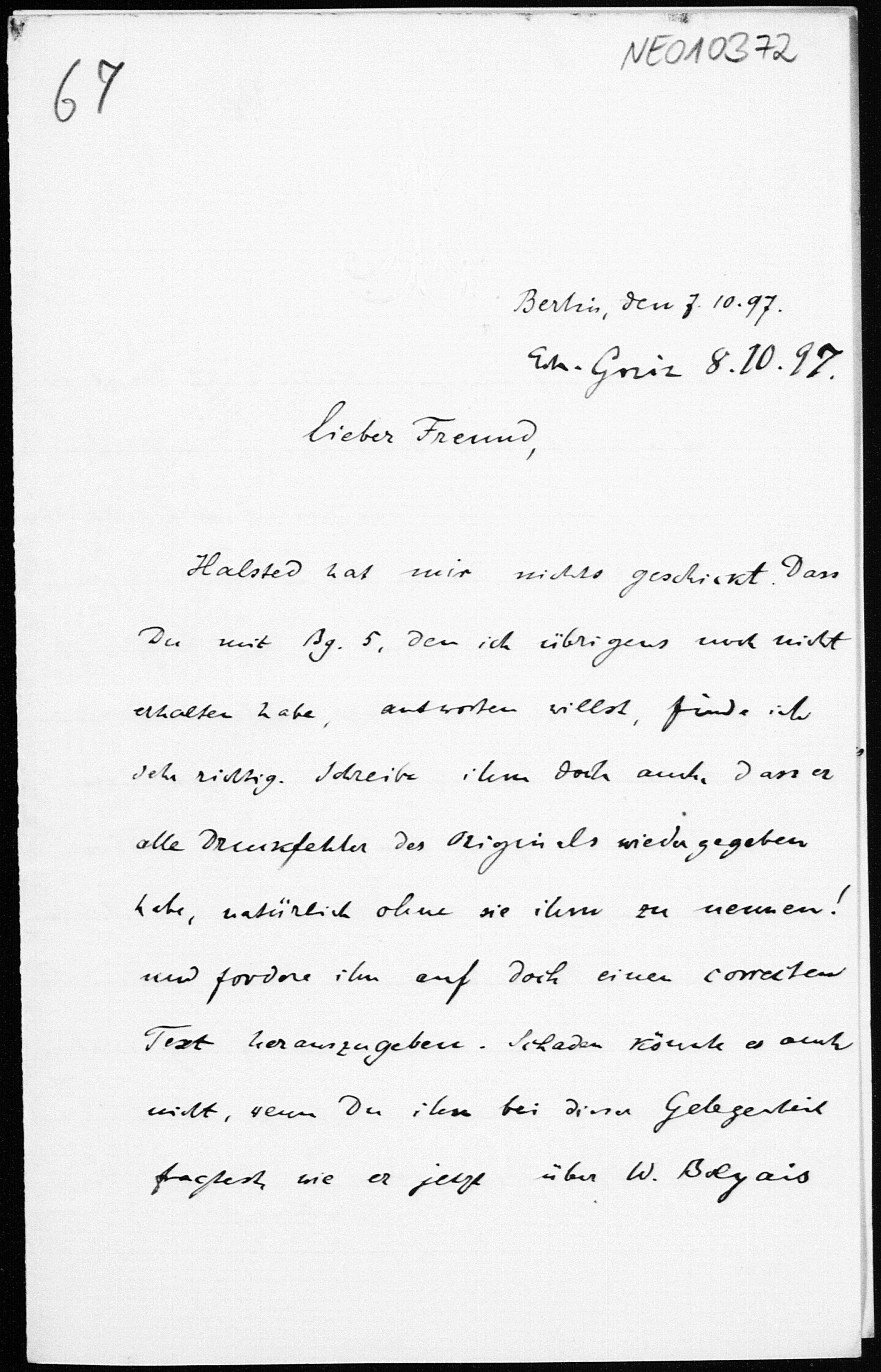 Brief von Paul Stäckel an Friedrich Engel vom 7.10.1897