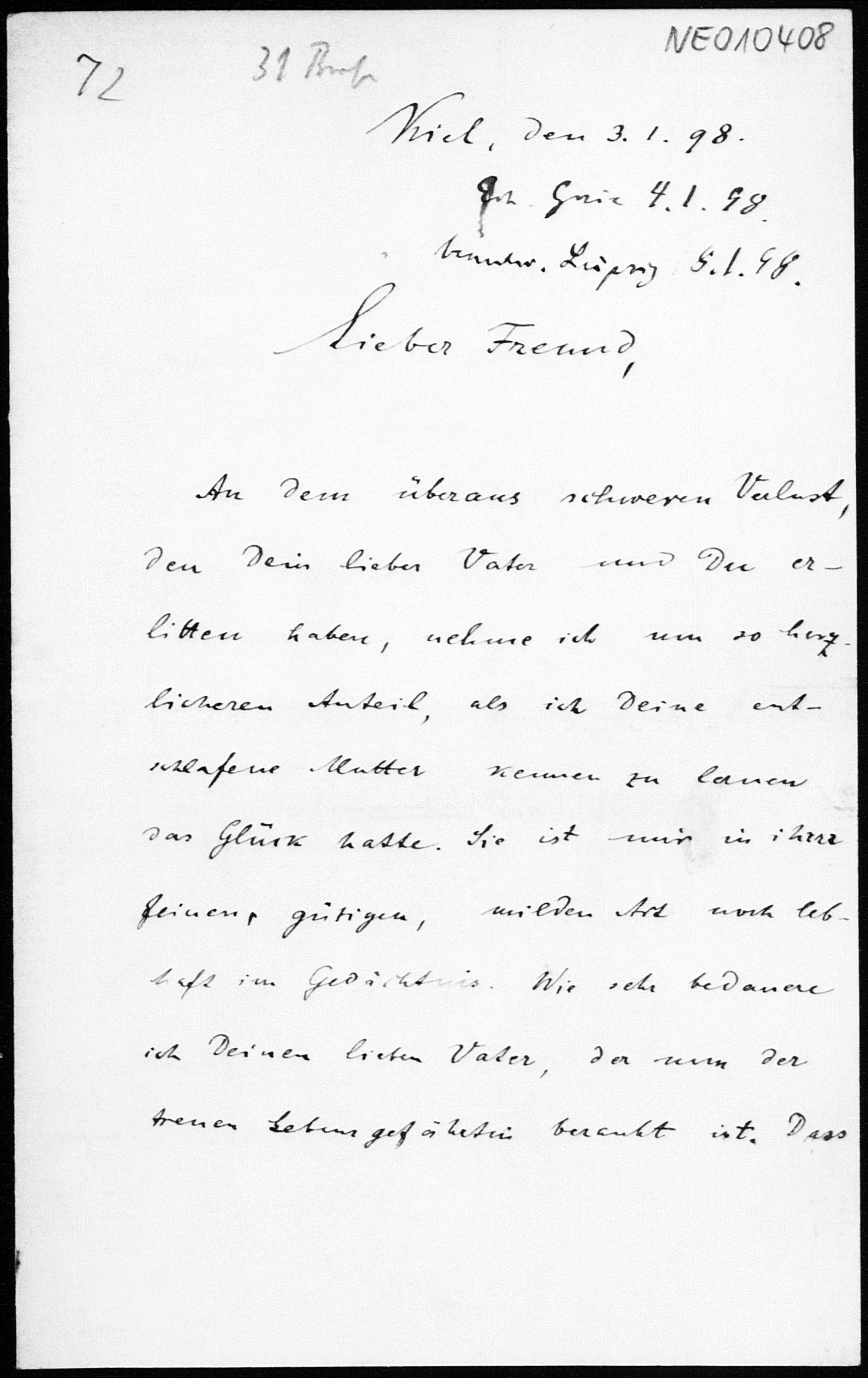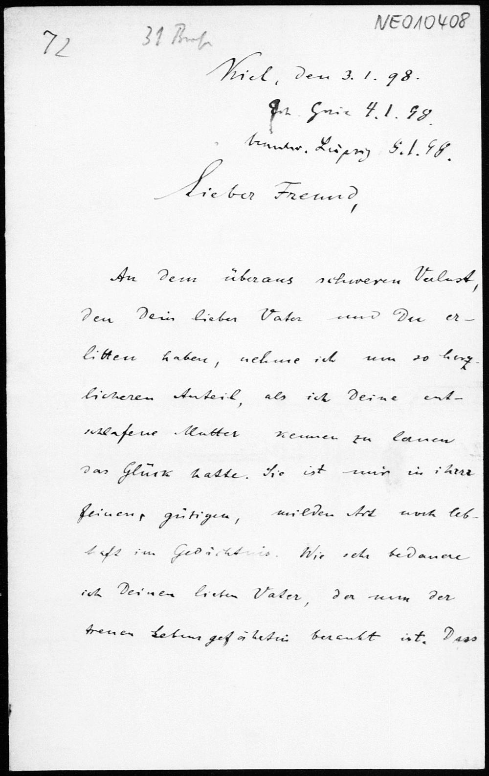 Brief von Paul Stäckel an Friedrich Engel vom 3.1.1898