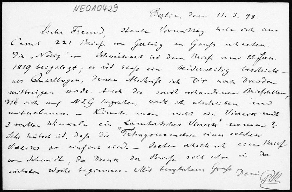 Postkarte von Paul Stäckel an Friedrich Engel vom 11.3.1898