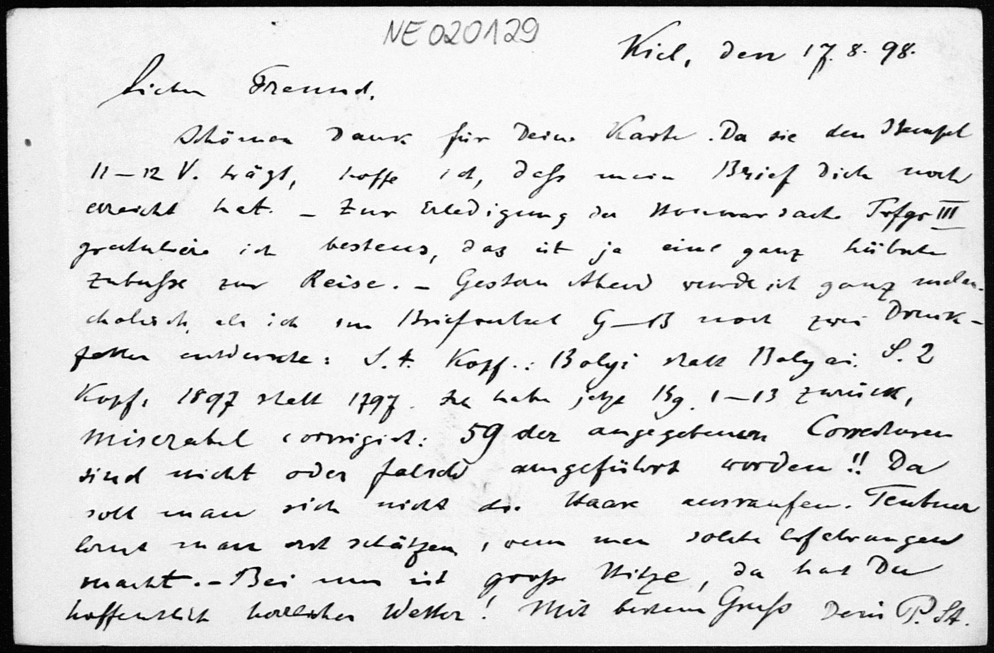 Postkarte von Paul Stäckel an Friedrich Engel vom 17.8.1898