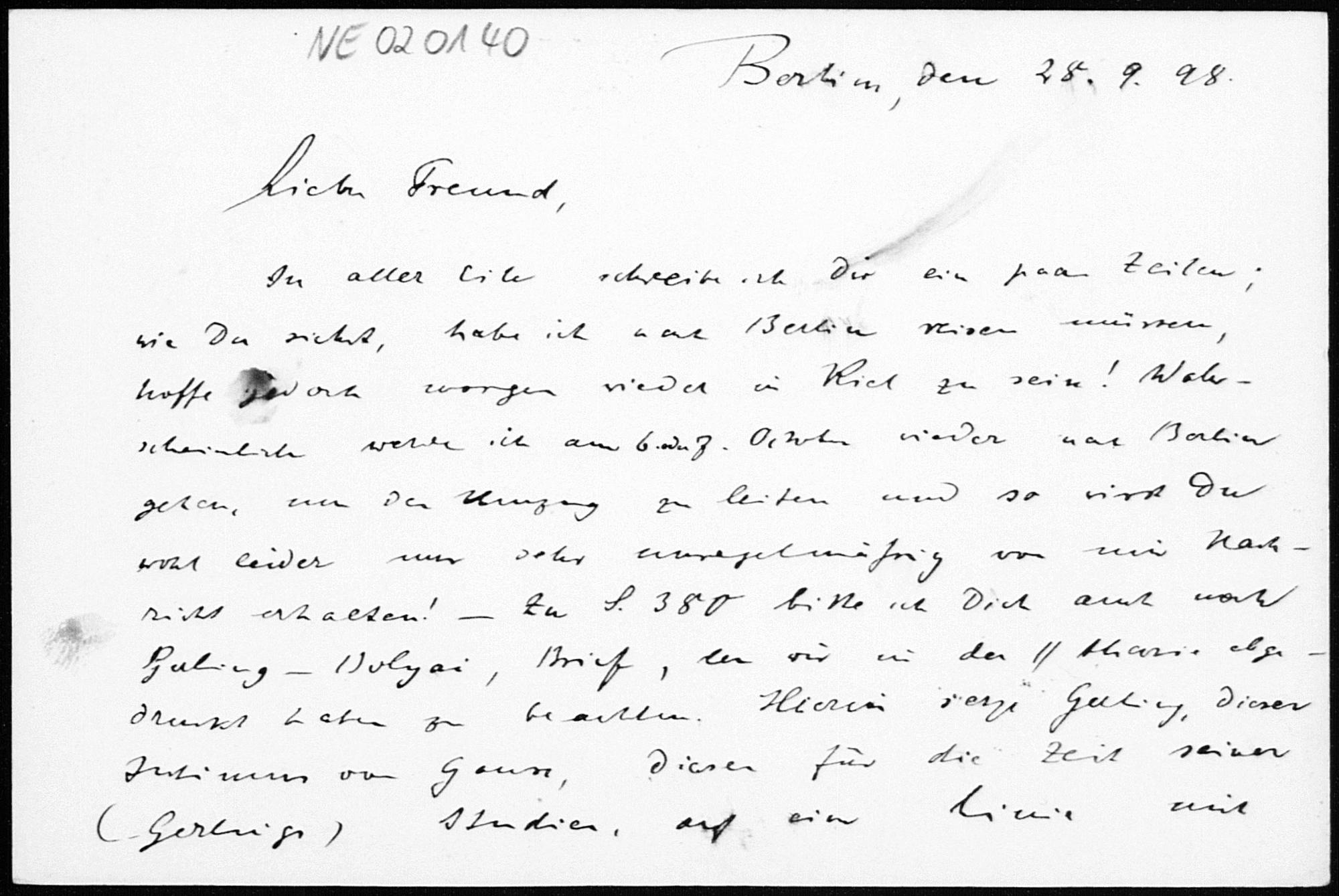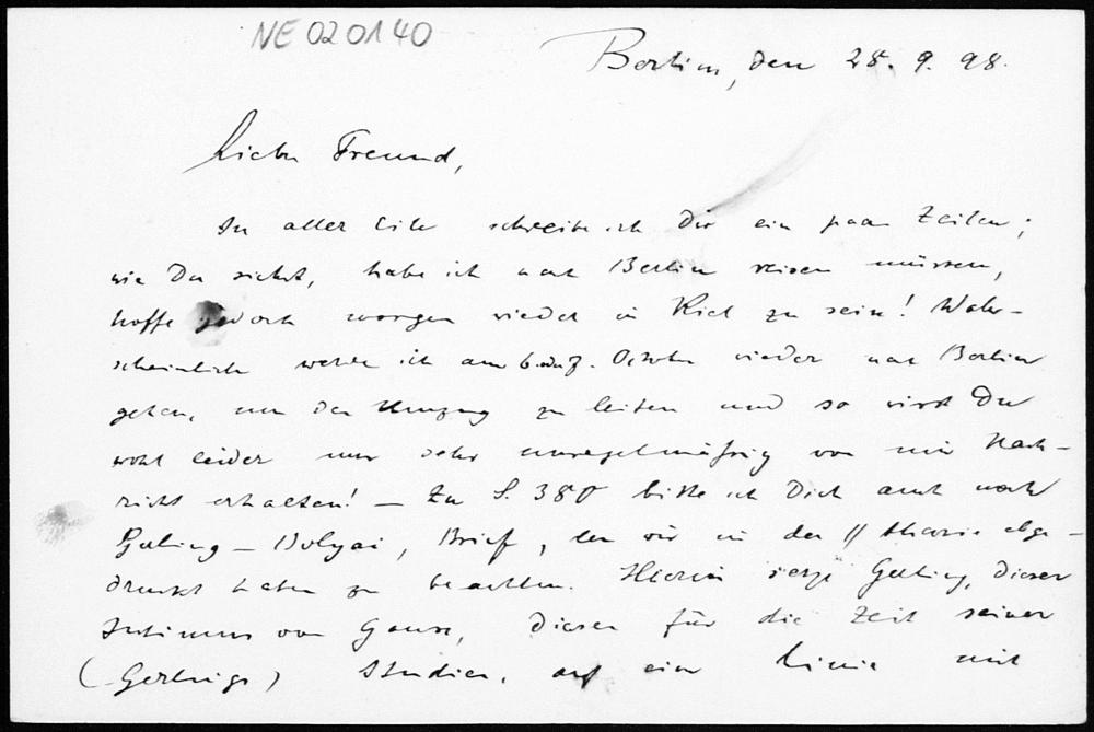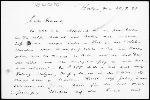 Postkarte von Paul Stäckel an Friedrich Engel vom 28.9.1898