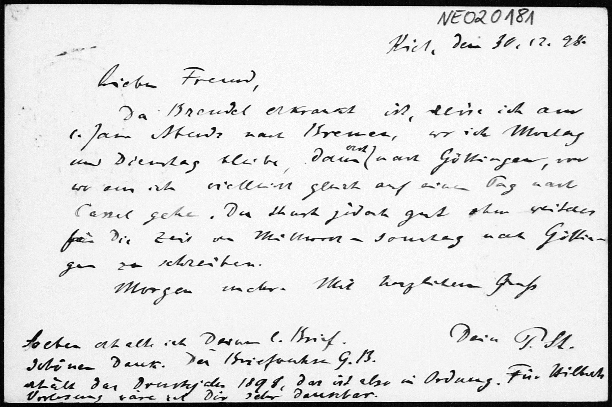 Postkarte von Paul Stäckel an Friedrich Engel vom 30.12.1898
