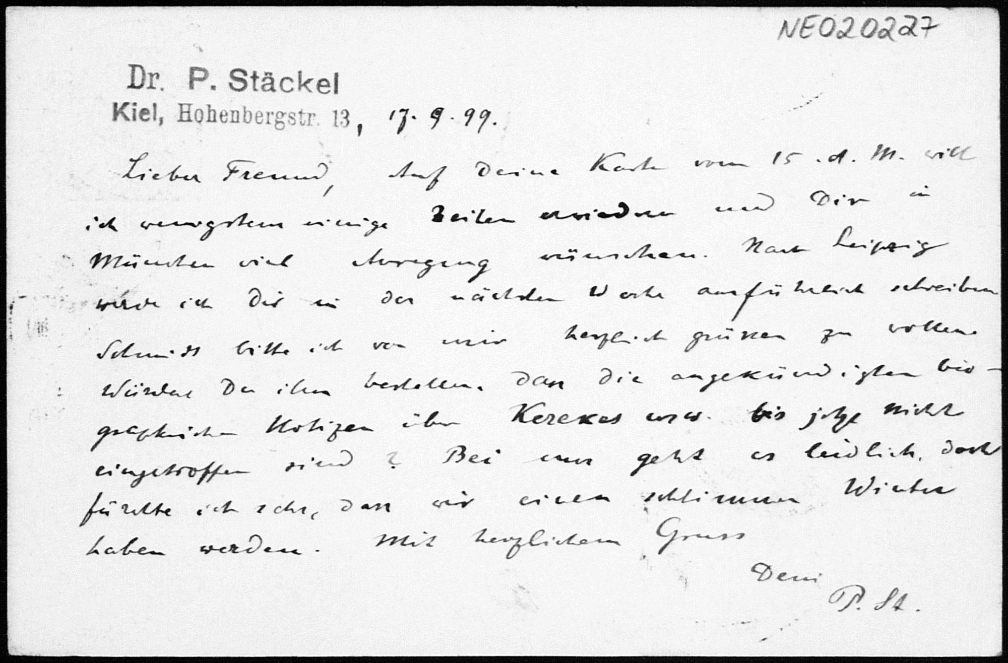 Postkarte von Paul Stäckel an Friedrich Engel vom 17.9.1899