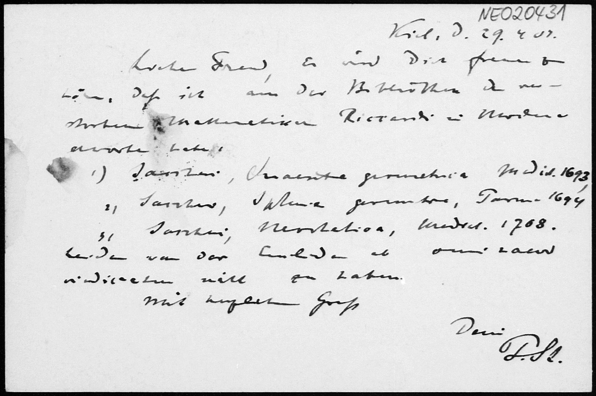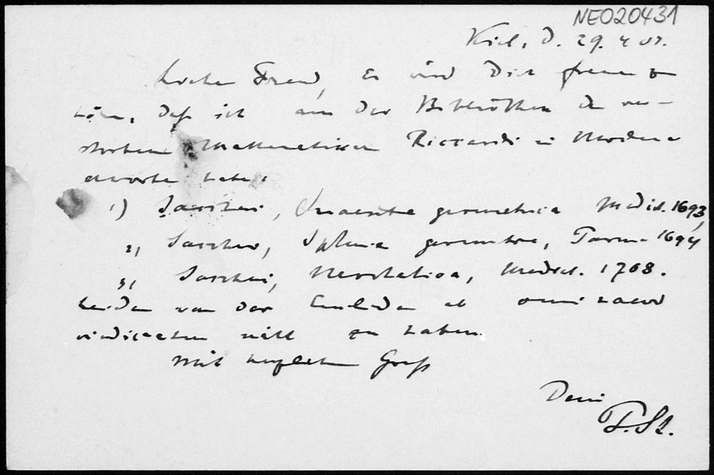 Postkarte von Paul Stäckel an Friedrich Engel vom 29.4.1904
