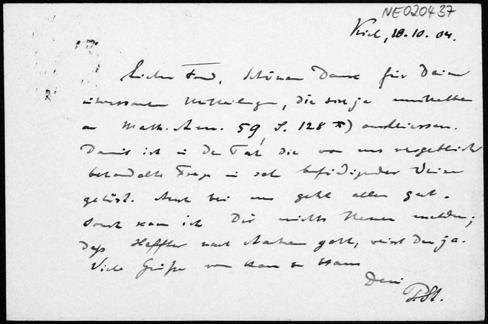 Postkarte von Paul Stäckel an Friedrich Engel vom 10.10.1904