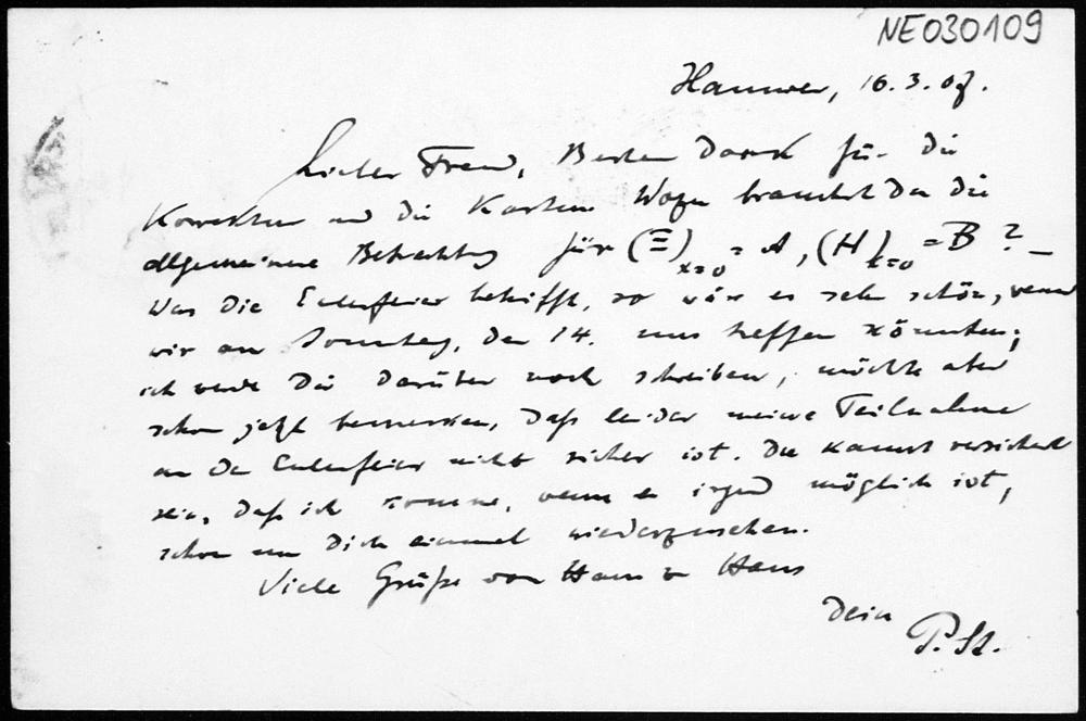 Postkarte von Paul Stäckel an Friedrich Engel vom 16.3.1907