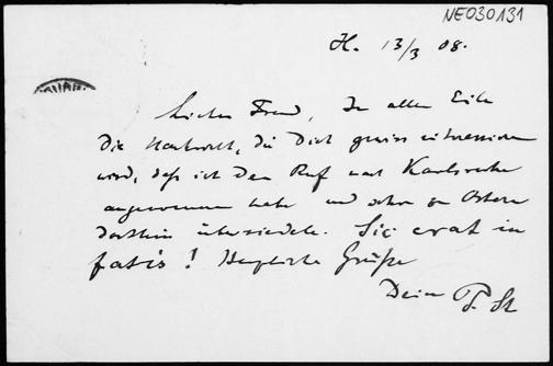 Postkarte von Paul Stäckel an Friedrich Engel vom 13.3.1908