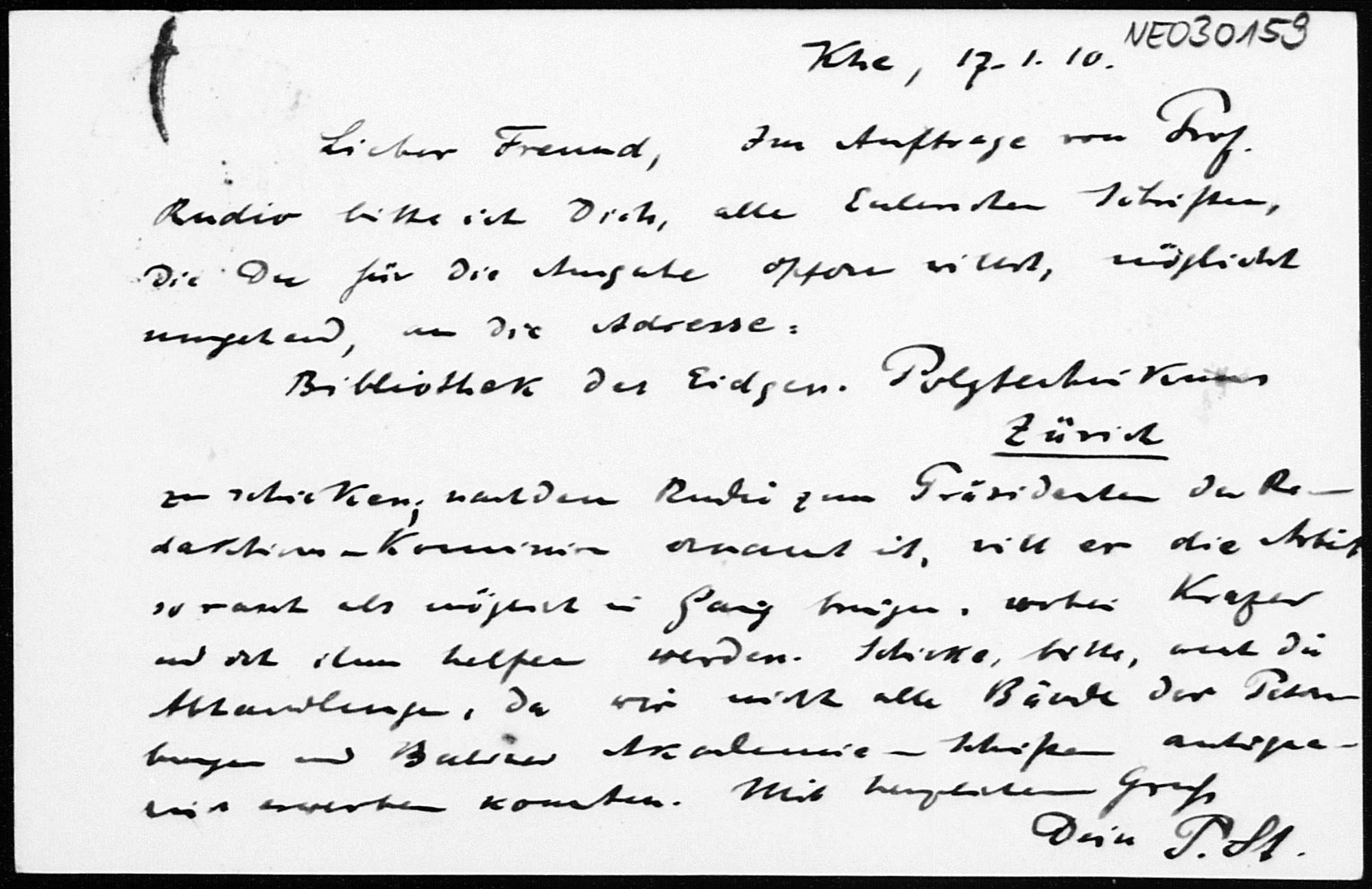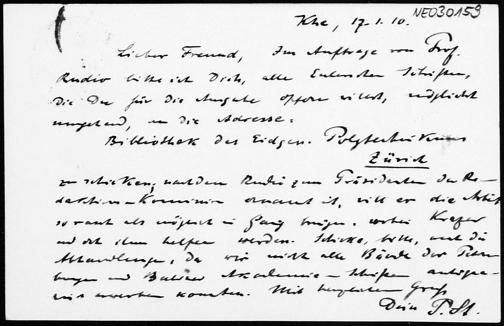 Postkarte von Paul Stäckel an Friedrich Engel vom 17.1.1910