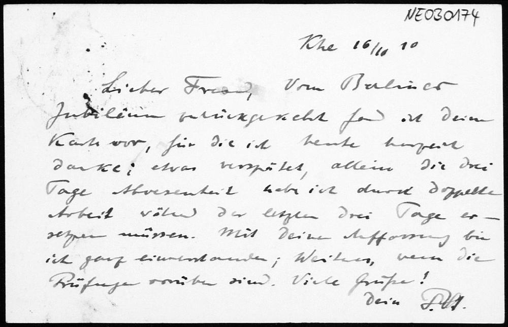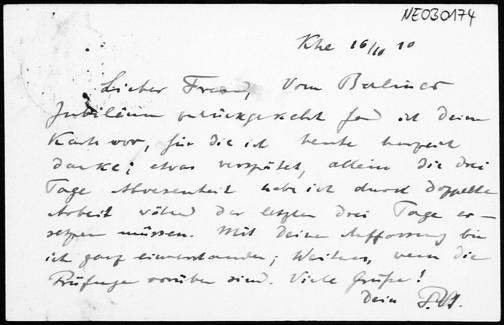 Postkarte von Paul Stäckel an Friedrich Engel vom 16.10.1910
