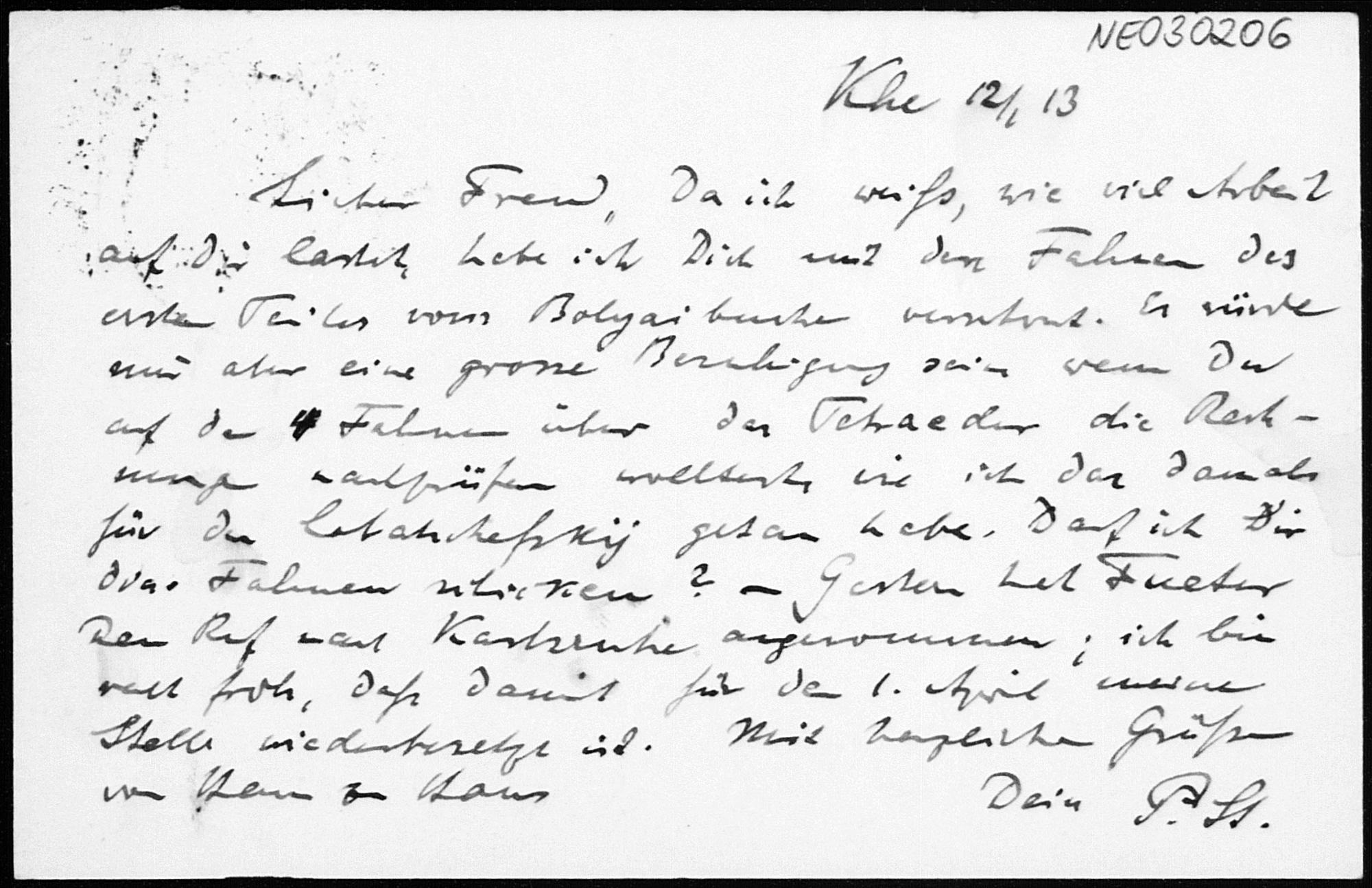 Postkarte von Paul Stäckel an Friedrich Engel vom 12.1.1913