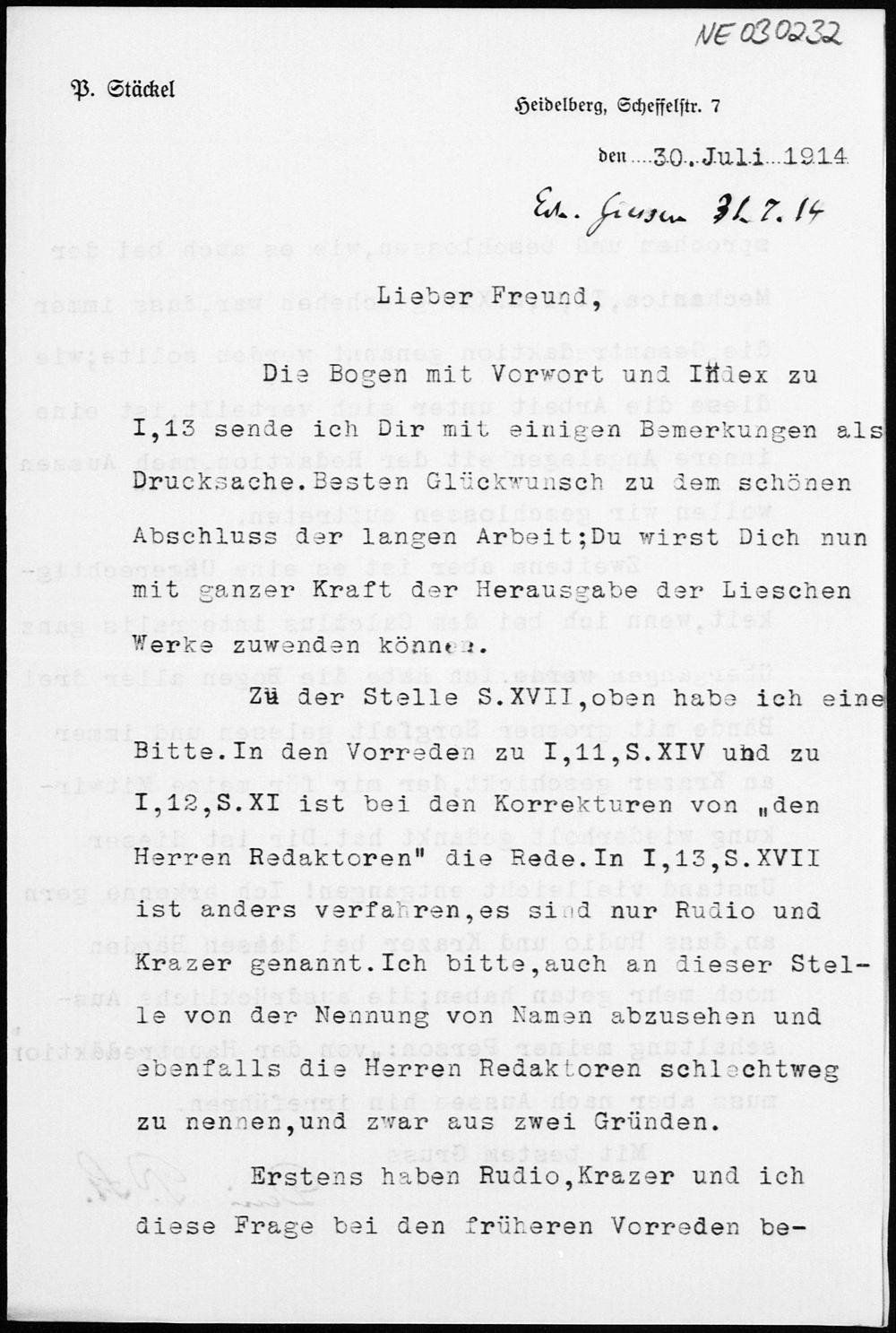 Brief von Paul Stäckel an Friedrich Engel vom 30.7.1914