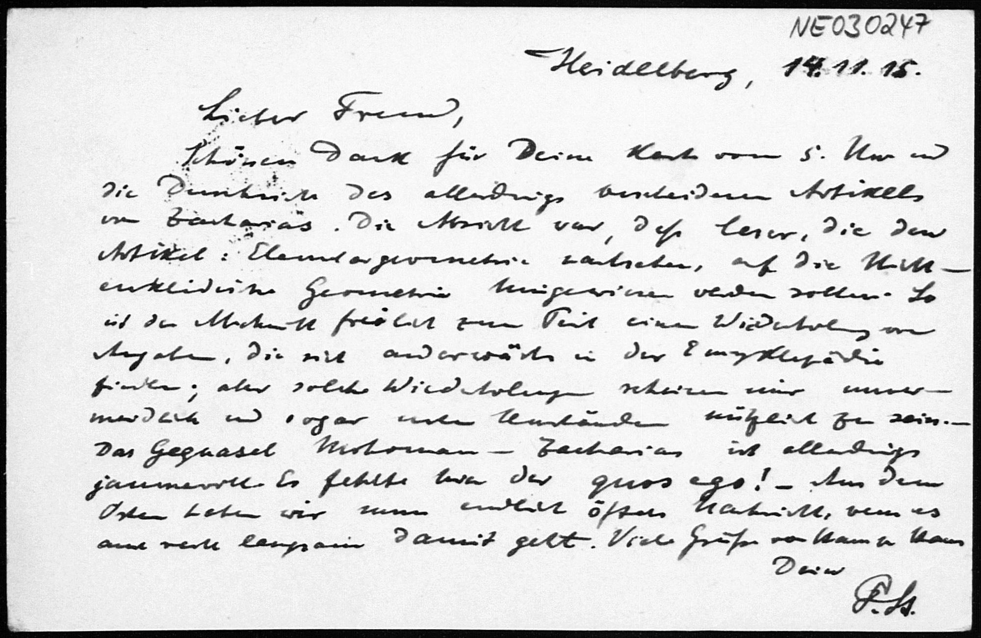 Postkarte von Paul Stäckel an Friedrich Engel vom 14.11.1915