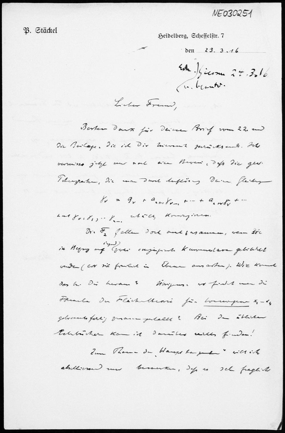 Brief von Paul Stäckel an Friedrich Engel vom 23.3.1916