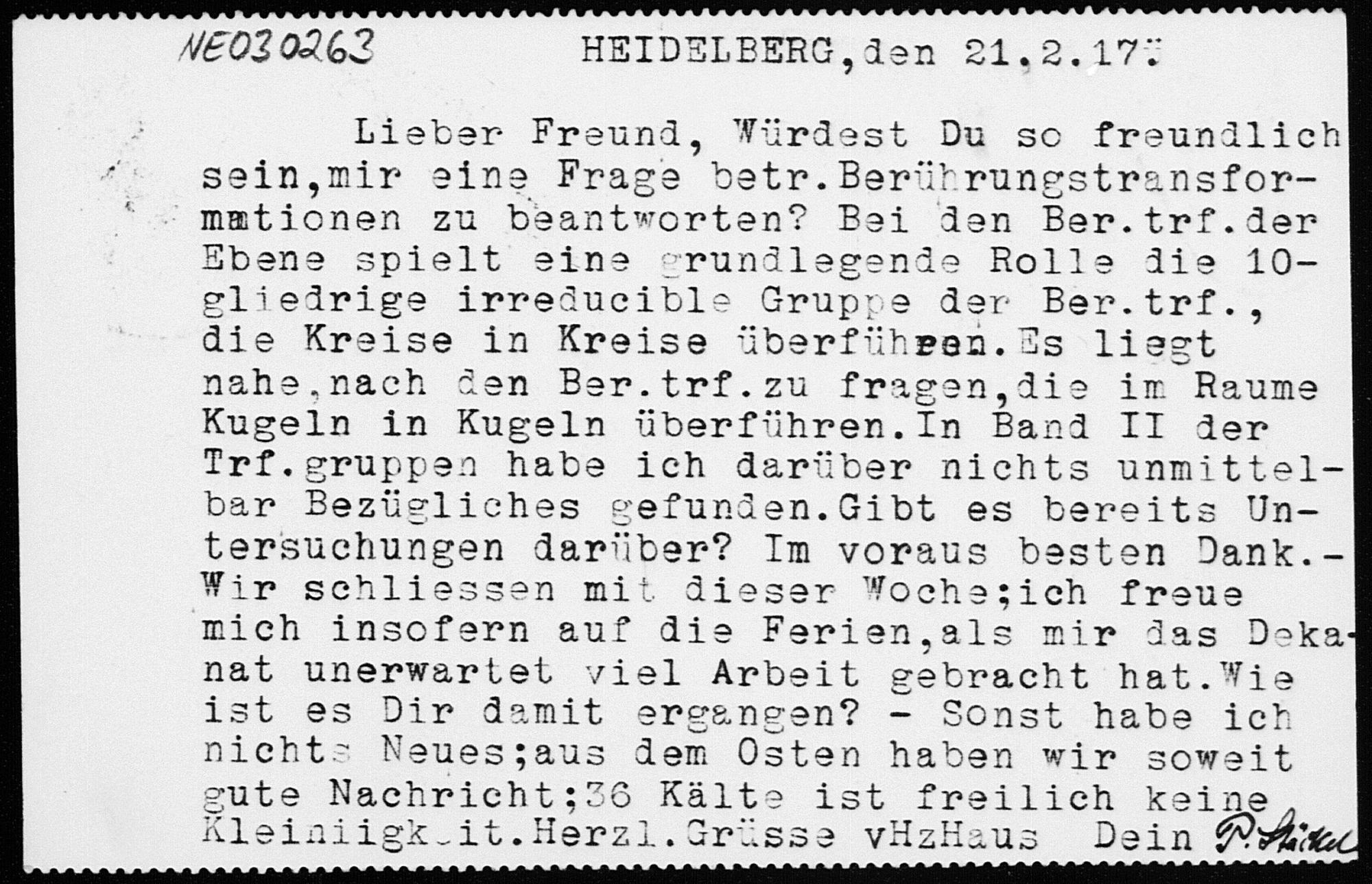 Postkarte von Paul Stäckel an Friedrich Engel vom 21.2.1917