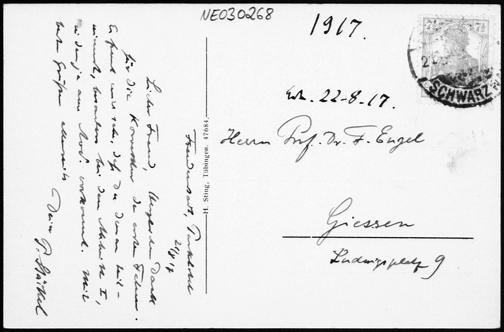 Ansichtskarte von Paul Stäckel an Friedrich Engel vom 21.8.1917