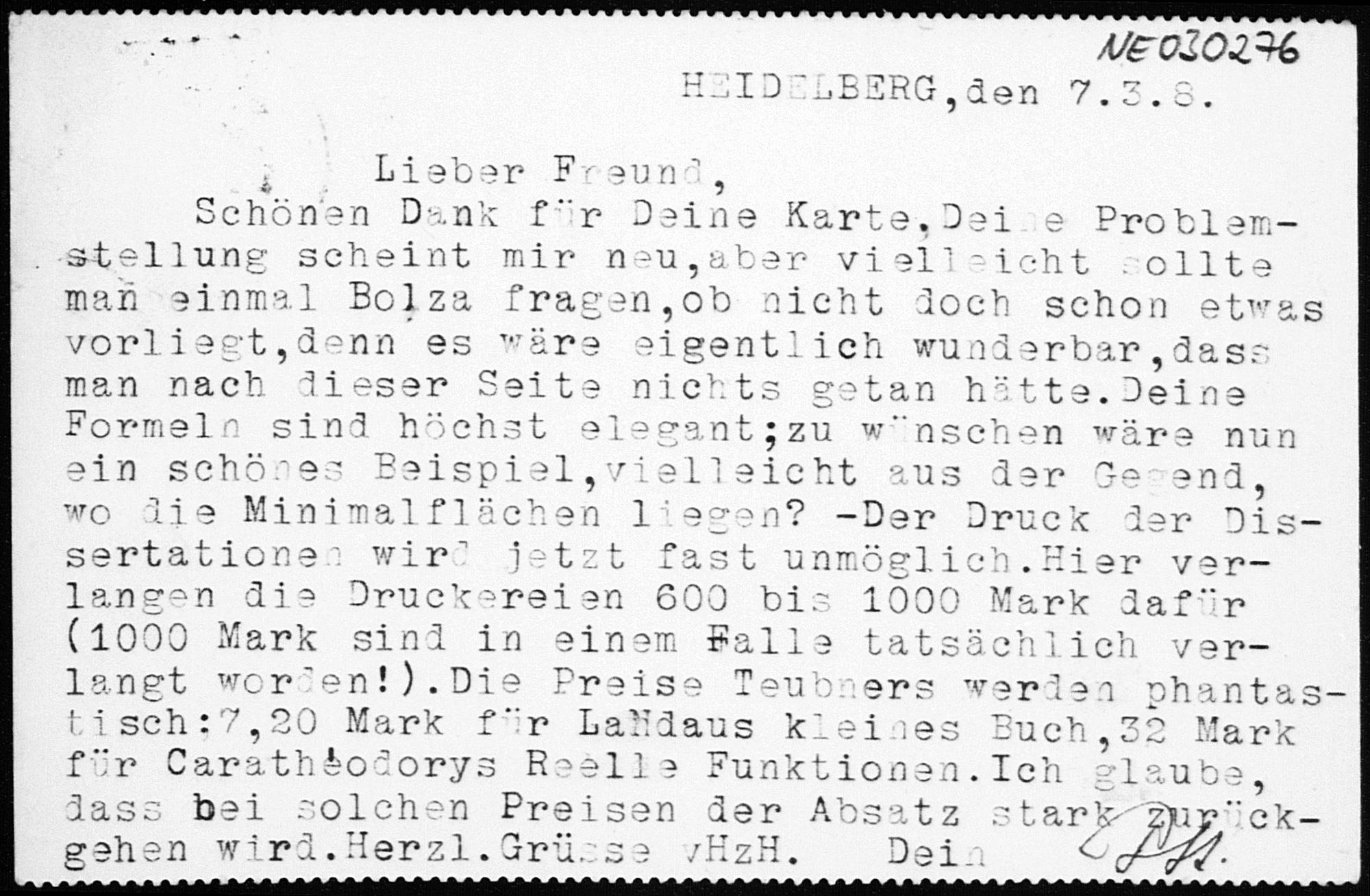 Postkarte von Paul Stäckel an Friedrich Engel vom 7.3.1918