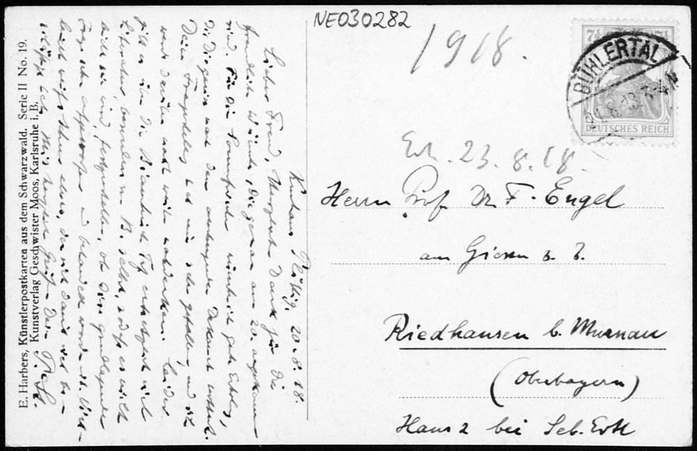 Ansichtskarte von Paul Stäckel an Friedrich Engel vom 20.8.1918