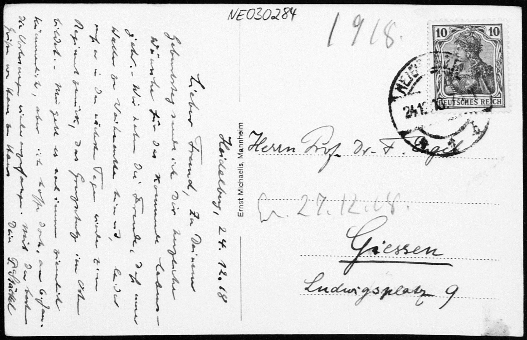 Ansichtskarte von Paul Stäckel an Friedrich Engel vom 24.12.1918