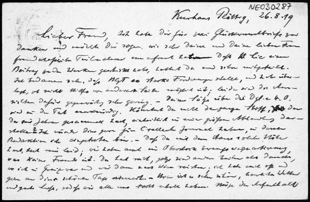 Postkarte von Paul Stäckel an Friedrich Engel vom 26.8.1919