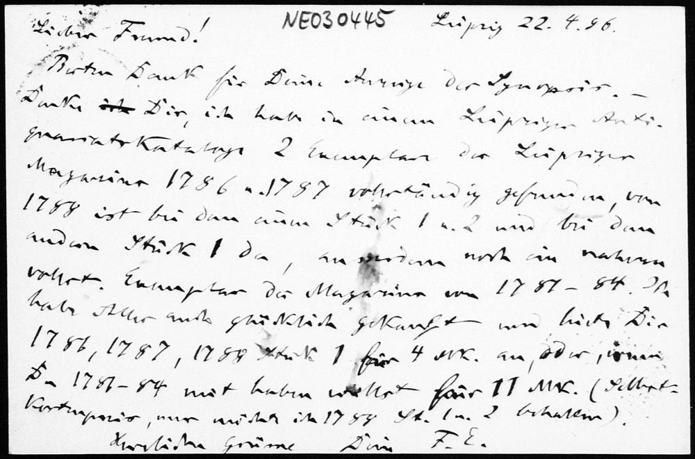 Postkarte von Friedrich Engel an Paul Stäckel vom 22.4.1896