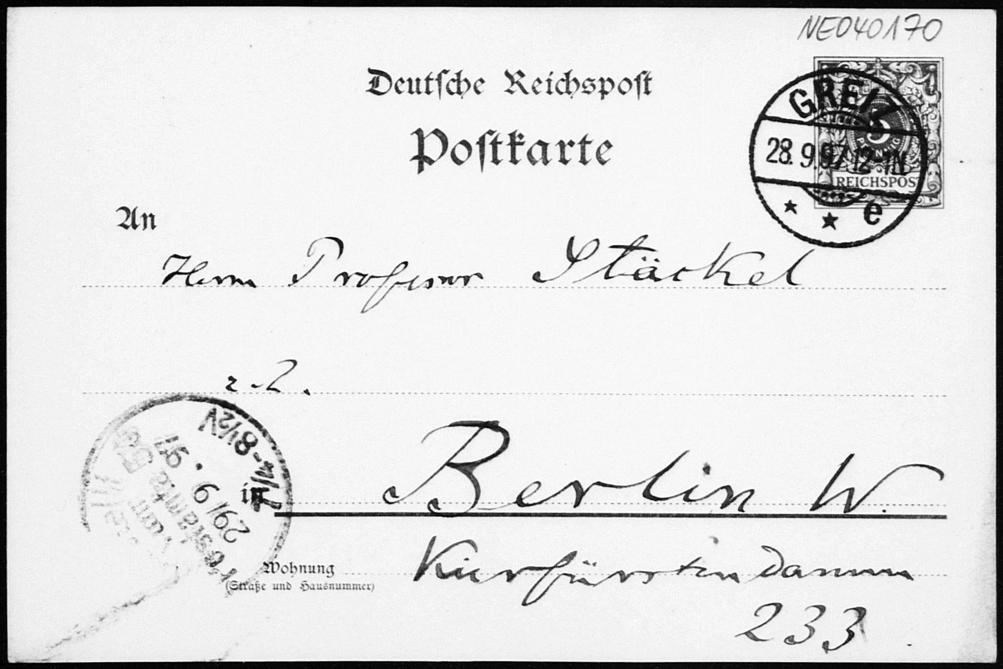 Postkarte von Friedrich Engel an Paul Stäckel vom 28.9.1897