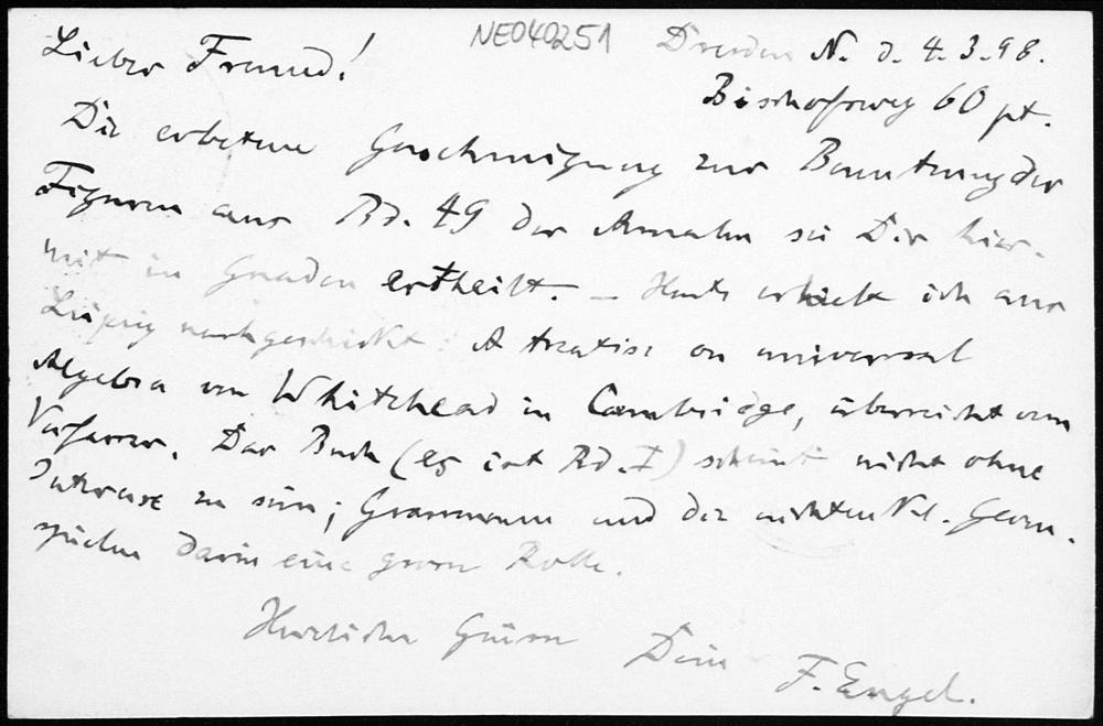 Postkarte von Friedrich Engel an Paul Stäckel vom 4.3.1898