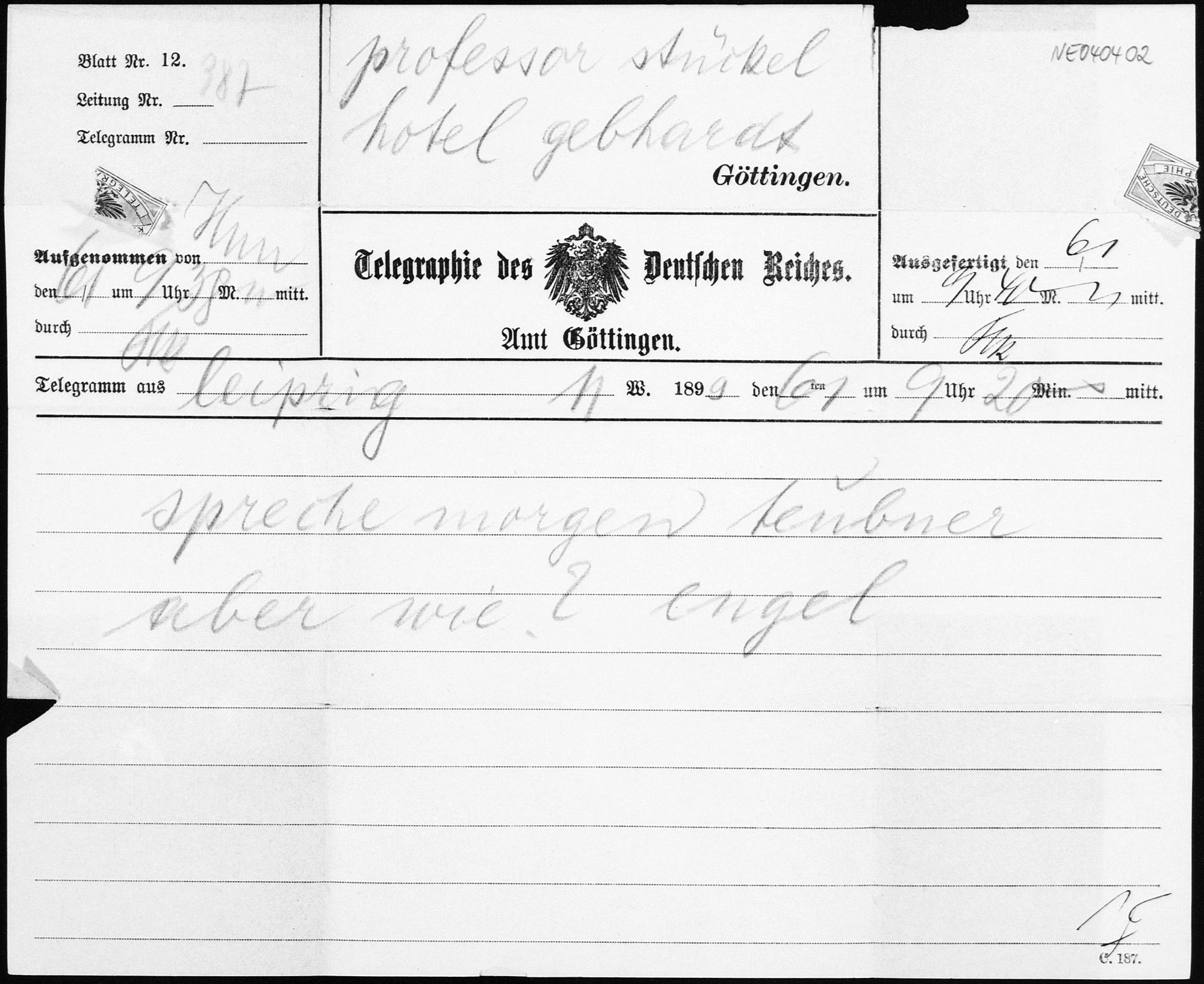 Telegramm von Friedrich Engel an Paul Stäckel vom 6.1.1899