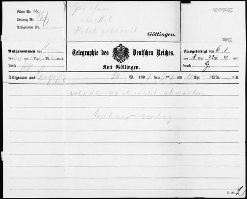 Telegramm von Friedrich Engel an Paul Stäckel vom 6.1.1899