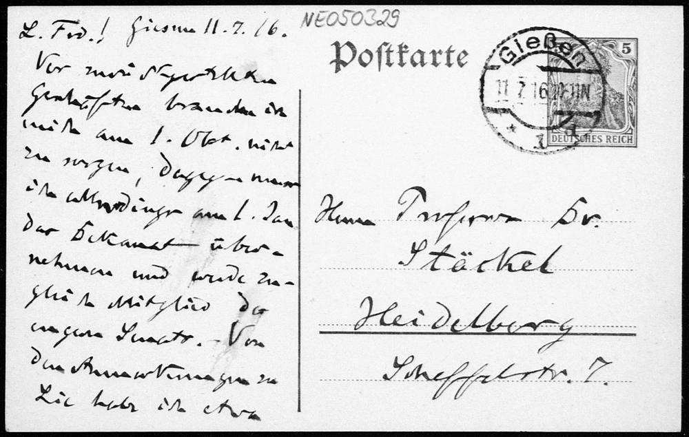 Postkarte von Friedrich Engel an Paul Stäckel vom 11.7.1916