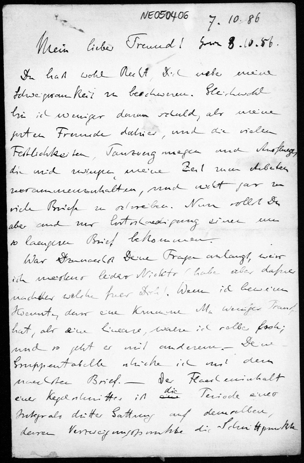 Brief von Eduard Study an Friedrich Engel vom 7.10.1886
