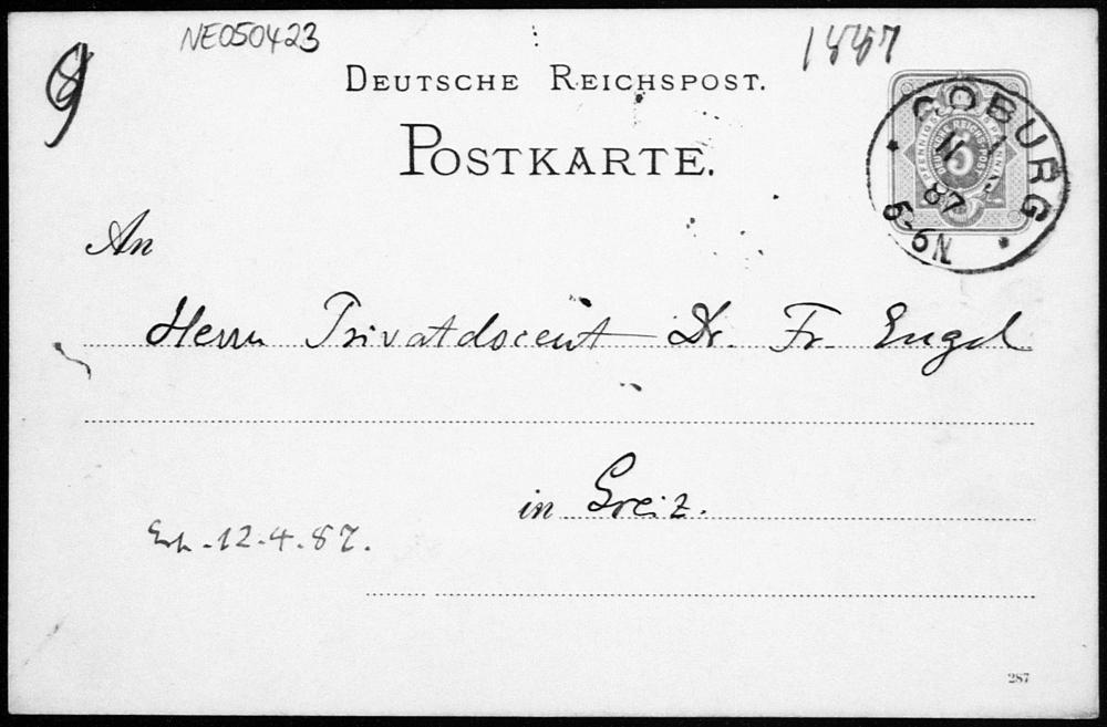 Postkarte von Eduard Study an Friedrich Engel vom 11.4.1887