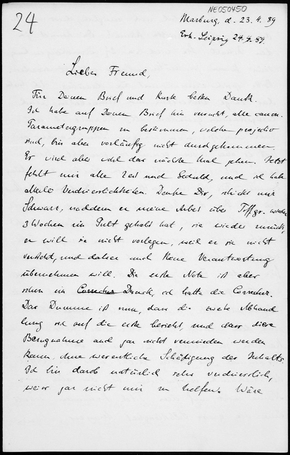 Brief von Eduard Study an Friedrich Engel vom 23.4.1889