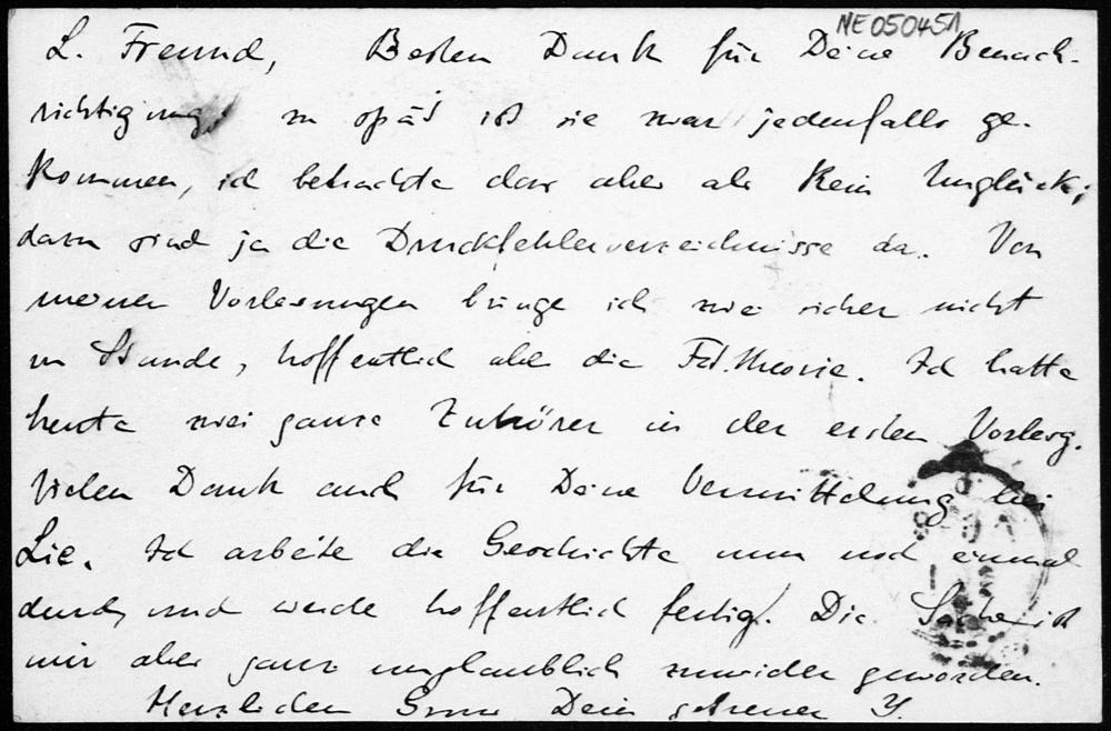Postkarte von Eduard Study an Friedrich Engel vom 30.4.1889