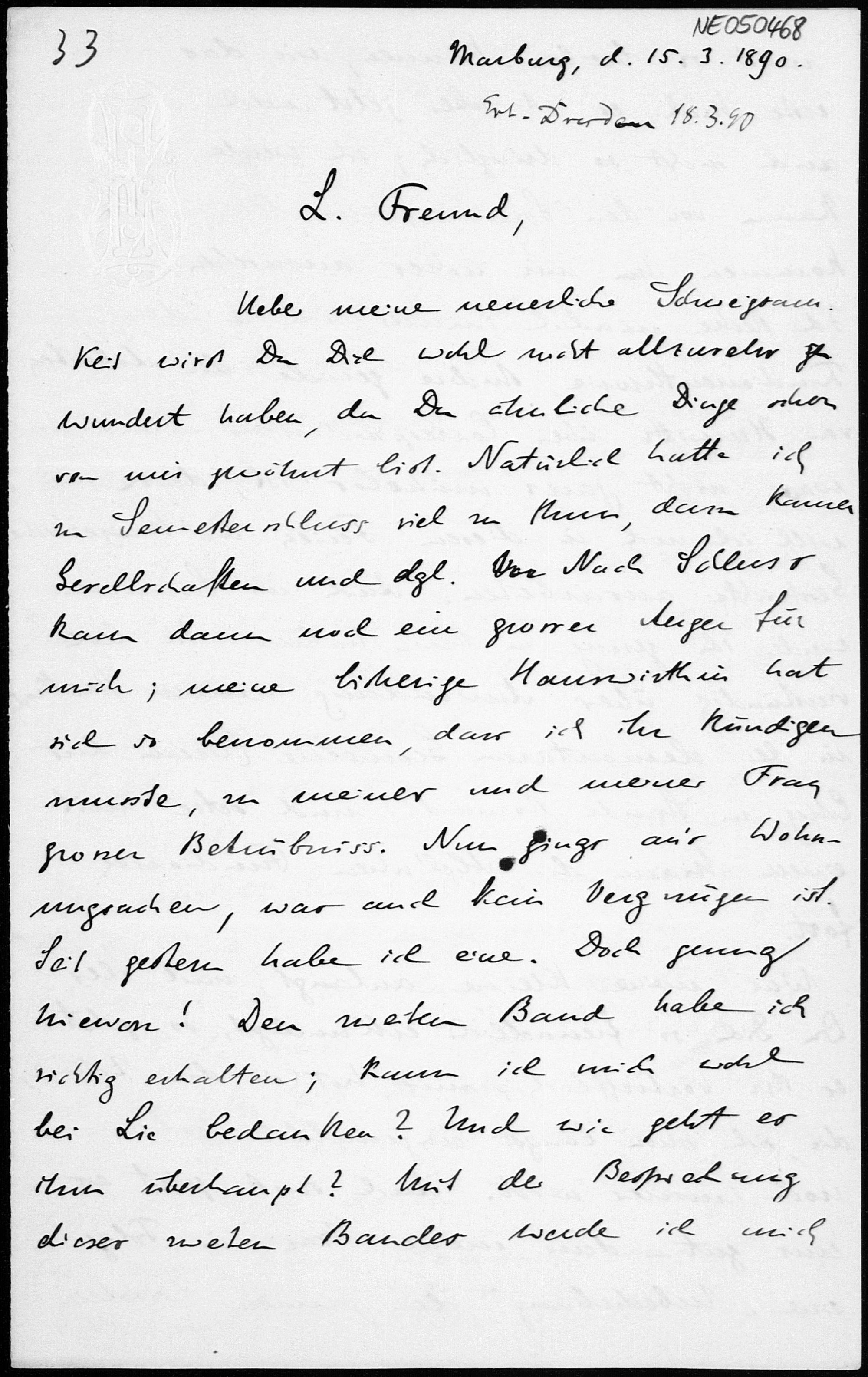 Brief von Eduard Study an Friedrich Engel vom 15.3.1890