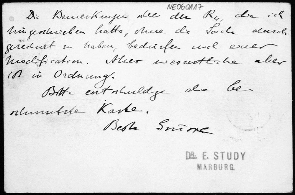 Postkarte von Eduard Study an Friedrich Engel vom 10.11.1890
