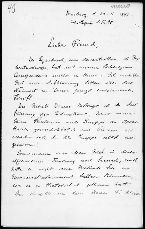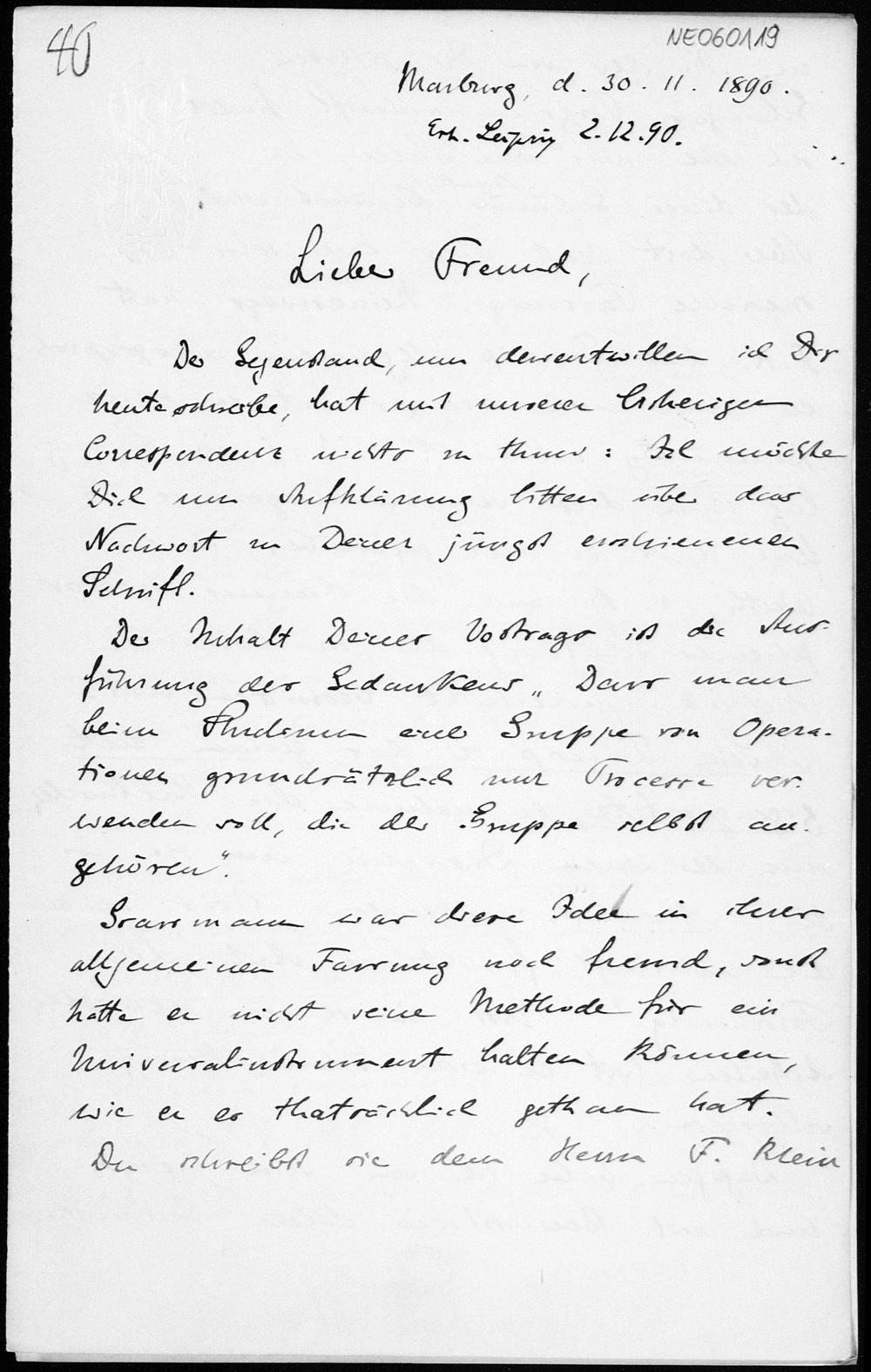 Brief von Eduard Study an Friedrich Engel vom 30.11.1890