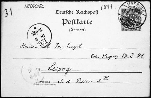 Postkarte von Eduard Study an Friedrich Engel vom 17.2.1891