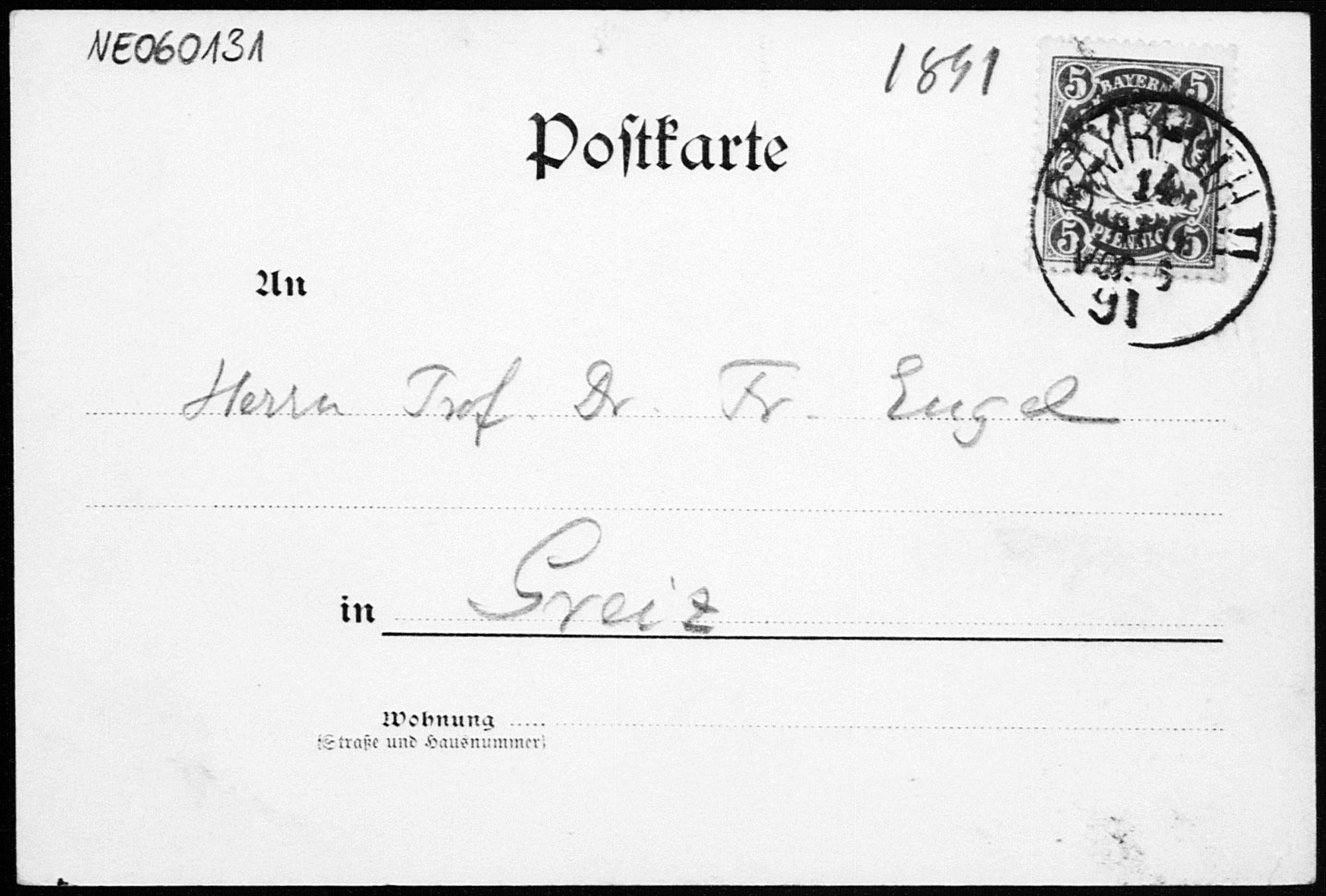 Ansichtskarte von Eduard Study an Friedrich Engel vom 14.??.1891 (mitunterzeichet von O. Müller und W. König)
