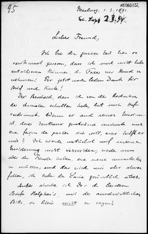 Brief von Eduard Study an Friedrich Engel vom 1.3.1891